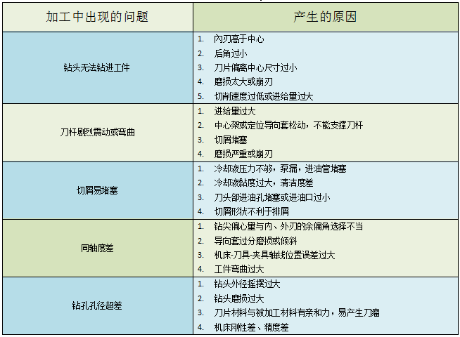 6. 槍鉆加工中常遇到的問題和產(chǎn)生的原因見下表: